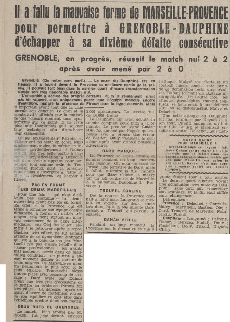 Nota : Marseille Provence bat Grenoble Dauphiné sur tapis vert 0-2. Le score initial était de 2 à 2, but de Castellani (3') et Doly (5') pour Grenoble Dauphine ; Dard (31') et Troupel (57') pour Marseille Provence. |