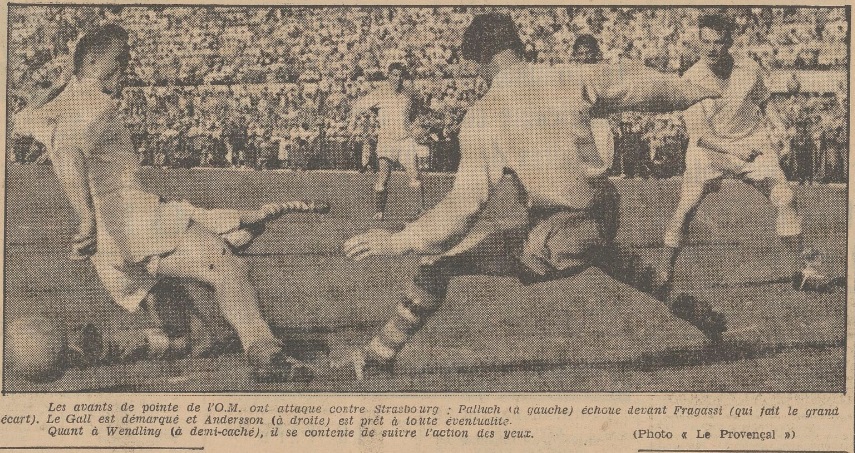 O.M. : 1 ; Strasbourg : 0 A la 60e minute, Le Gall échappe à la surveillance de Borkowski et shoote dans sa foulée. O.M. : 2 ; Strasbourg : 0 Vingt secondes après le Rennais récidive, mais l'arbitre signale hors-jeu. À la 64e minute sur centre de Palluch, Ben Barek rate de peu la conclusion sur Heading. À la 68e minute, après combinaison avec Vandooren, Ben Barek et le Gall, Andersson manque un but (le second) tout fait. Gransart sert Ben Barek dont la balle frôle le poteau. À la 76e minute, Hertrich se fait soigner sur la touche à la suite d'une collision avec Gransart, tandis qu'Angel arrête le coup franc. À la 78e minute, Le Gall descend trop et Fragassi reste maître de la situation, puis Andersson voit sa balle passer légèrement en haut du cadre et Kaelbel retire littéralement la sphère du but et Le Gall botte sur le poteau alors que Fragassi était battu. À la 84e minute Ben Barek lobe imparfaitement, le gardien visiteur, mais il y a hors-jeu, puis Skojaspal shoote à côté. À trois minutes de la fin, Wendling gêne Le Gall et c'est au tour d'Angel de sauver dans les pieds. La balle effectue encore deux ou trois voyages et c'est la fin. Georges LEOST |