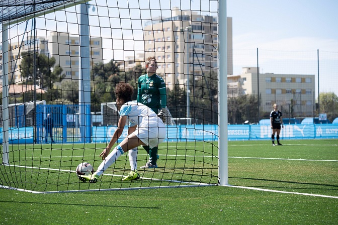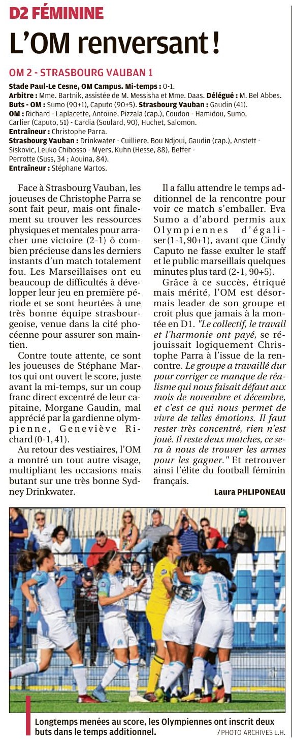 Menées 1-0 à la fin du temps réglementaire, les joueuses de Christophe Parra ont trouvé les ressources pour recoller au score puis prendre l'avantage dans le temps additionnel. Les Olympiennes profitent du faux-pas de Saint-Étienne, leur concurrent direct pour la montée, à Nancy. L'OM est seul leader du championnat ! Il y a des matchs où les émotions sont plus fortes que d'autres. Cette rencontre face à Strasbourg en est la plus belle illustration. Devancées par Saint-Étienne au classement d'un petit point, les Olympiennes avaient l'obligation de gagner si elles voulaient croire encore à une éventuelle accession en D1. Seulement elles sont tombées face à une équipe de Strasbourg bien armée et venue à Marseille pour jouer. Les Olympiennes se sont laissées piéger en fin de première période. La capitaine adverse a ouvert le score sur coup franc direct permettant ainsi à Strasbourg de regagner le vestiaire avec l'avantage au tableau d'affichage. En seconde période, les Olympiennes évoluaient avec le vent en leur faveur et se sont procurées un nombre incalculable d'occasions. La gardienne strasbourgeoise, en feu, a réalisé des parades exceptionnelles et lorsqu'elle était battue, ses coéquipières faisaient le travail. Seulement, à force de persévérance, la chance a fini par sourire aux Olympiennes dans le temps additionnel. D'abord, Sumo trompait Drinkwater d'une frappe dans la surface de réparation. Puis, l'arbitre accordait un dernier coup franc à l'OM. Pizzala s'en est chargé, trouvant Caputo au second poteau qui ne laissait aucune chance à la gardienne adverse. Le stress et l'impatience ont laissé place à une explosion de joie. D'autant plus que Saint-Étienne n'a ramené qu'un match nul de Nancy (2-2). Les Olympiennes prennent donc, seules, la tête du classement et sont plus proches que jamais d'un retour en D1. Leur destin est entre leurs mains... La réaction de Christophe Parra "Je suis très fier de ce que les filles ont réalisé. Ce n'est pas évident. C'est ce qui nous a manqué durant le mois de novembre qui a été compliqué. Des équipes qui sont venues jouer de cette façon là, ici, il y en a eu quelques-unes et on n'avait pas connu l'échec. Aujourd'hui, le groupe a pris en maturité, en harmonie, en cohésion. Le résultat du jour en est le fruit. Bravo à elles même si on a été en difficulté en première mi-temps. En deuxième mi-temps, le travail a été fait pour mettre en difficulté le bloc adverse. On a beaucoup pêché dans la finition. La beauté du sport, c'est ce que nous avons vécu aujourd'hui. Tout est réalisable même dans les situations les plus critiques. C'est une belle leçon de sport. Ce groupe travaille. Il n'y a pas de calcul, il faut tout gagner."