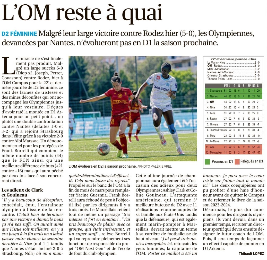 Nos Olympiennes se sont imposées 5 buts à 0 contre Rodez à l'OM Campus mais dans le même temps, Nantes a battu Albi. L'OM termine à la troisième place du classement et n'accède pas à la D1.
