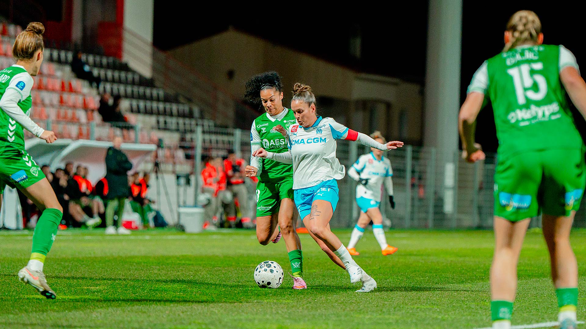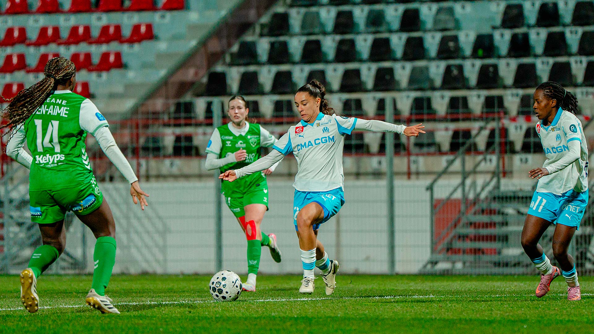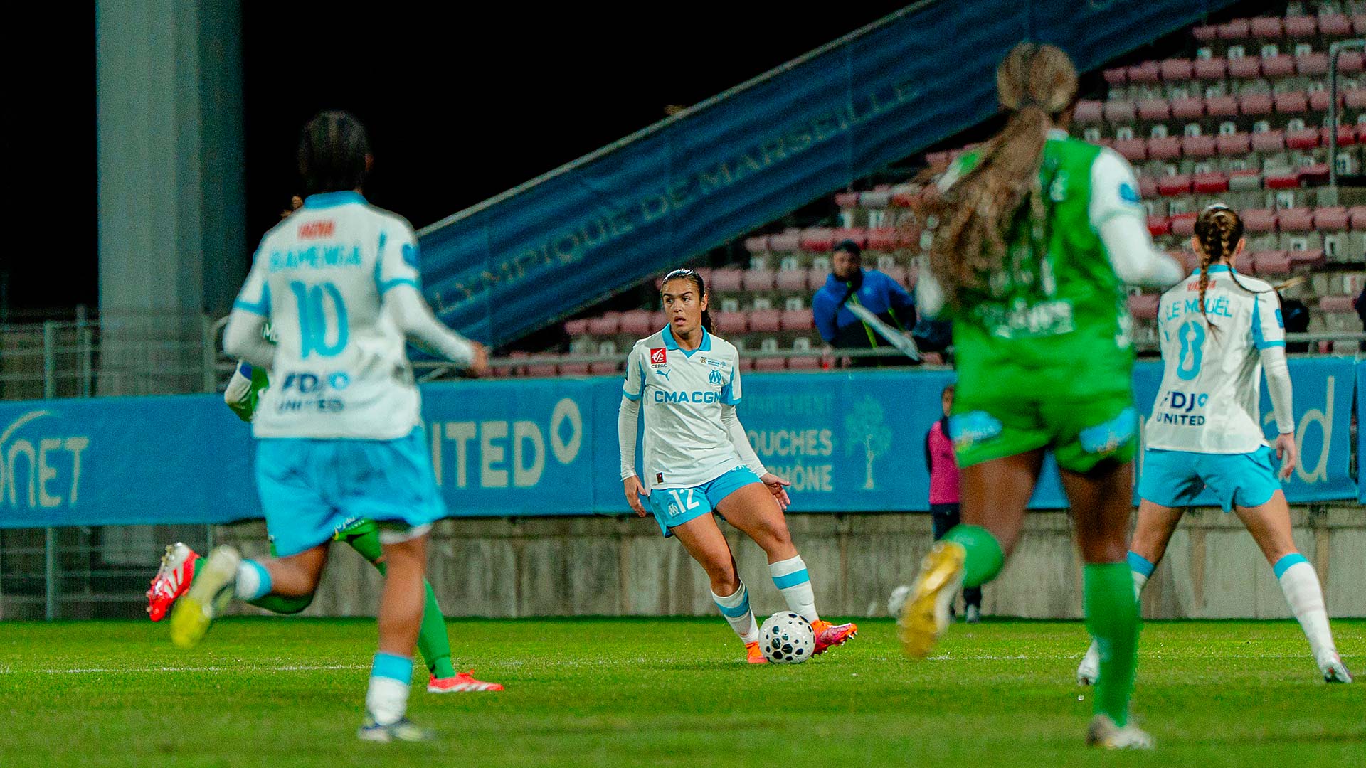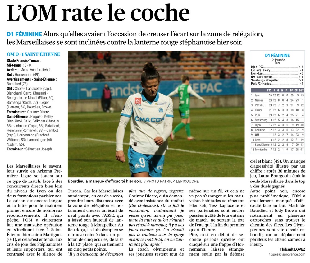 Mercredi soir, les Marseillaises se sont inclinées 1 à 0 à Martigues face à l'AS Saint-Etienne. Pour la 12e journée d'Arkema Première Ligue les Marseillaises accueillaient l'ASSE au stade Francis-Turcan de Martigues. Après une première période plutôt équilibrée où chaque formation a eu ses moments forts, les Vertes ont pris l'avantage au retour des vestiaires. Malgré une seconde période de haute intensité de la part des joueuses de Corinne Diacre, elles n'ont pas pu égaliser. Les Marseillaises ont même terminé la rencontre à dix contre onze après la sortie sur civière de Ninon Blanchard. Au classement, l'OM reste neuvième avec onze points. Lors de la prochaine journée, le samedi 17 janvier à 17 heures, l'OM se déplacera sur la pelouse du FC Fleury 91. |