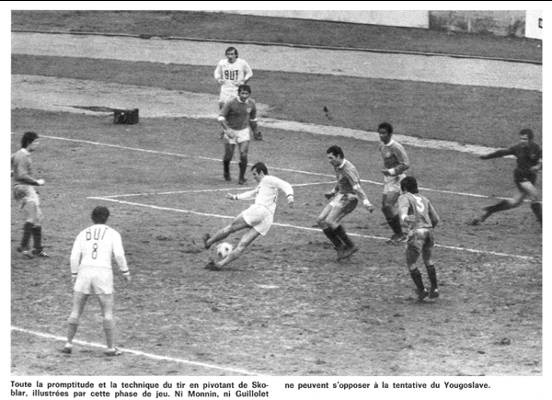 - L'histoire de ce coup franc est assez confuse. Skoblar eut "des mots" devant les buts du Red Star avec le gardien Laudu et l'arrière central Monin, envoyant un coup : sur la tête de ce dernier. Celui-ci voulut se venger et bouscula Skoblar par derrière. L'arbitre sanctionna cette faute par un coup franc tiré de plus de 25 mètres. Le tir de Skoblar fut magnifique et Laudu ne pouvait rien contre ce "boulet de canon".
